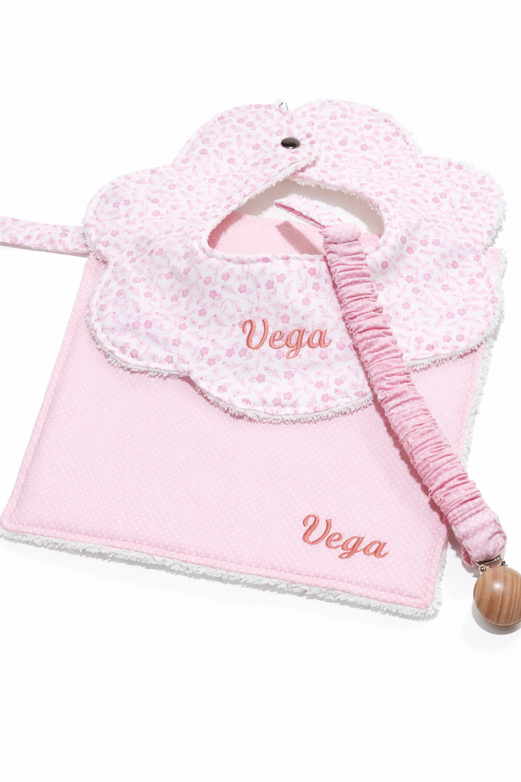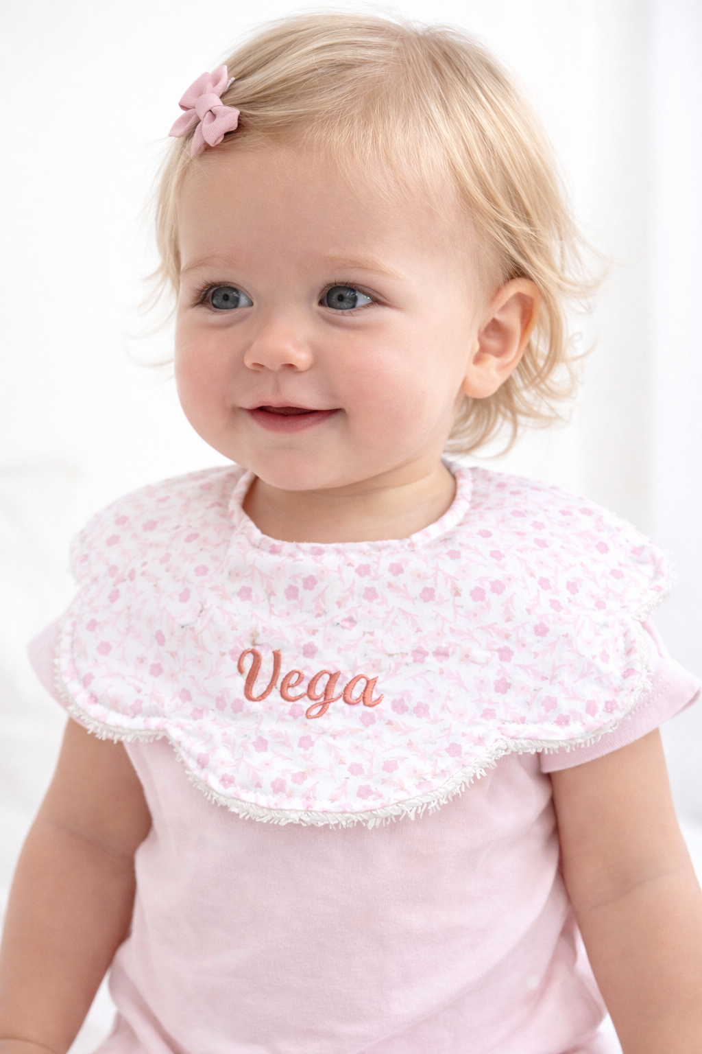 Babero con forma de flor y tela estampada de flores rosas con rizo 100% algodón.