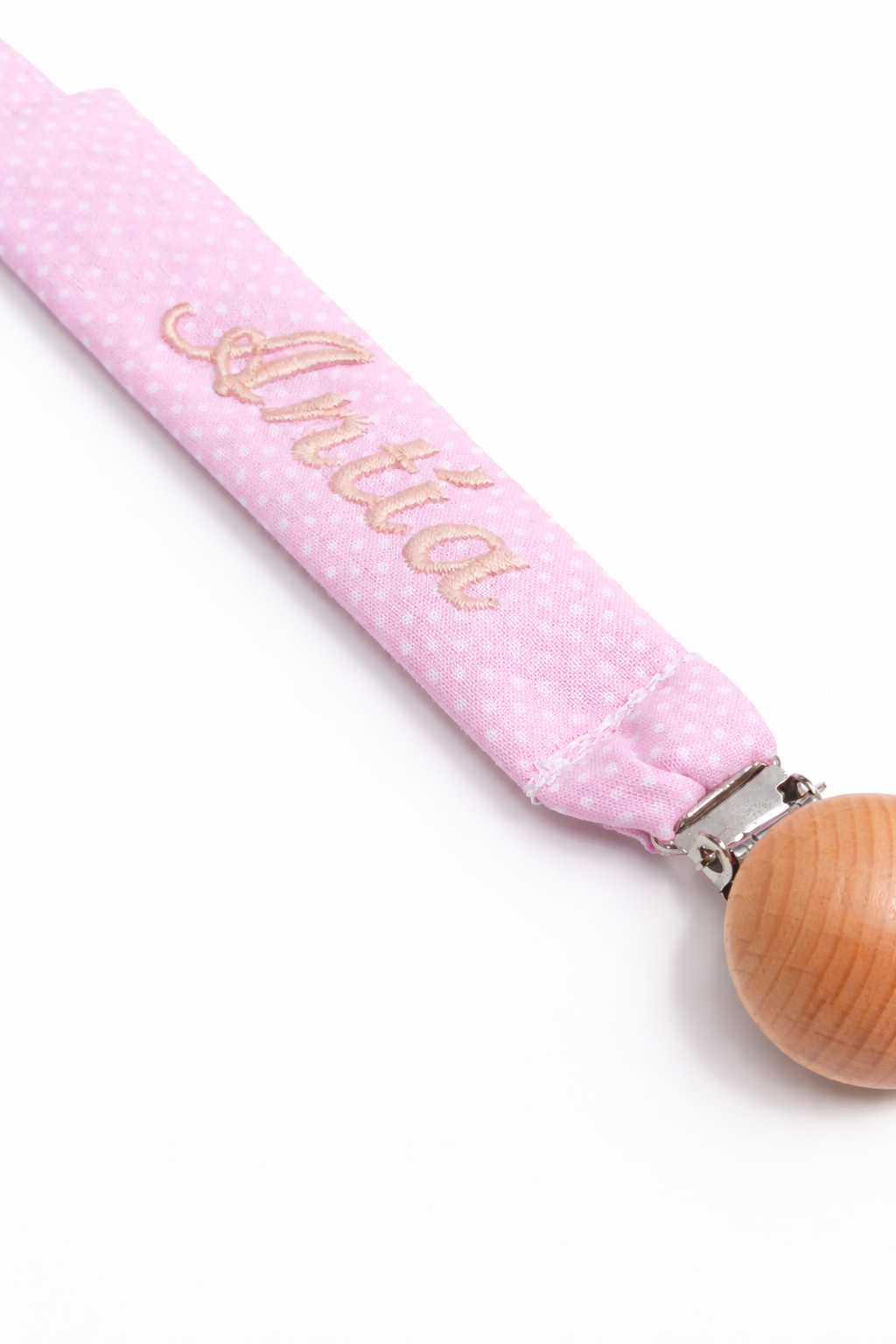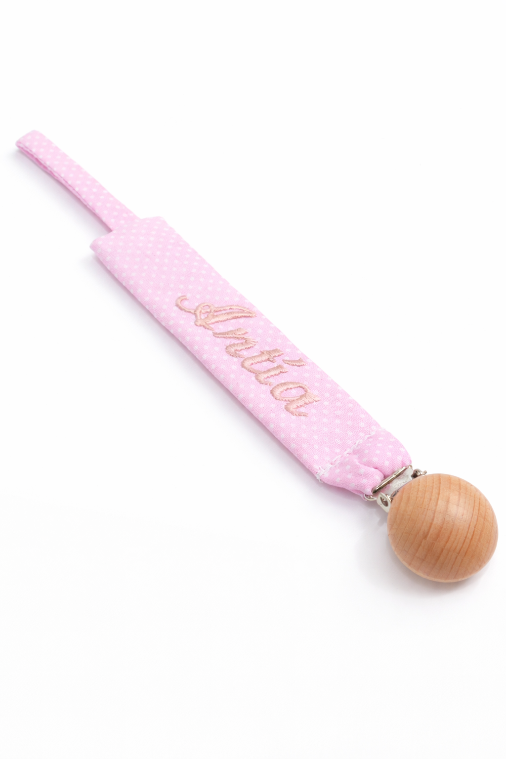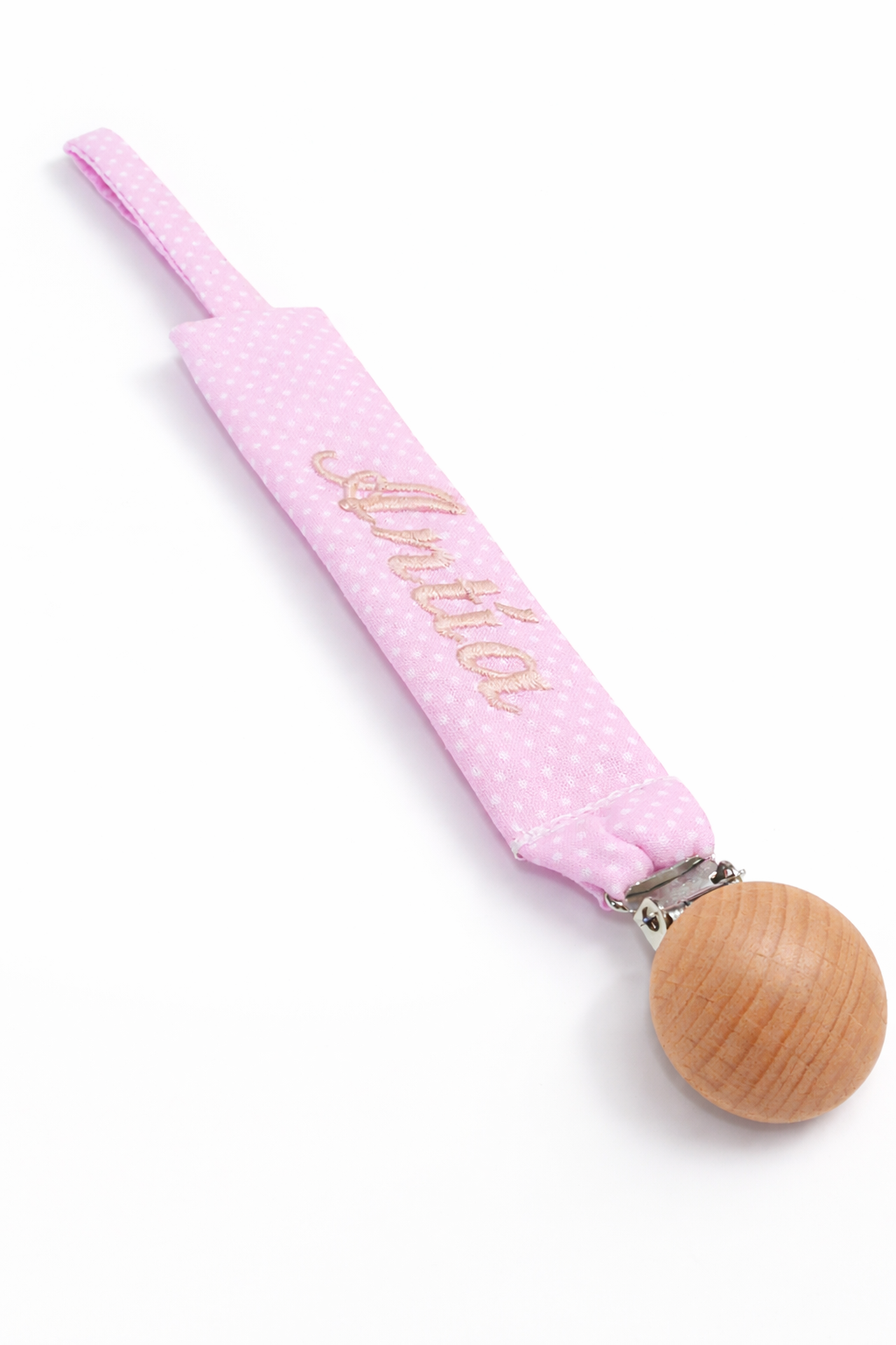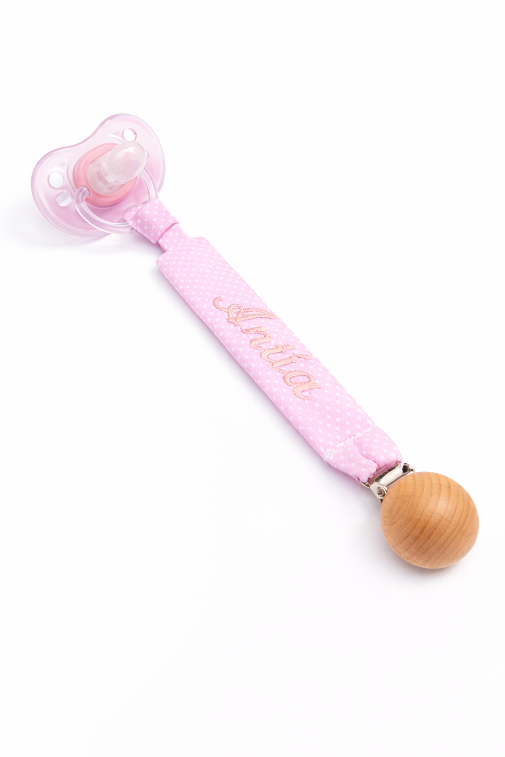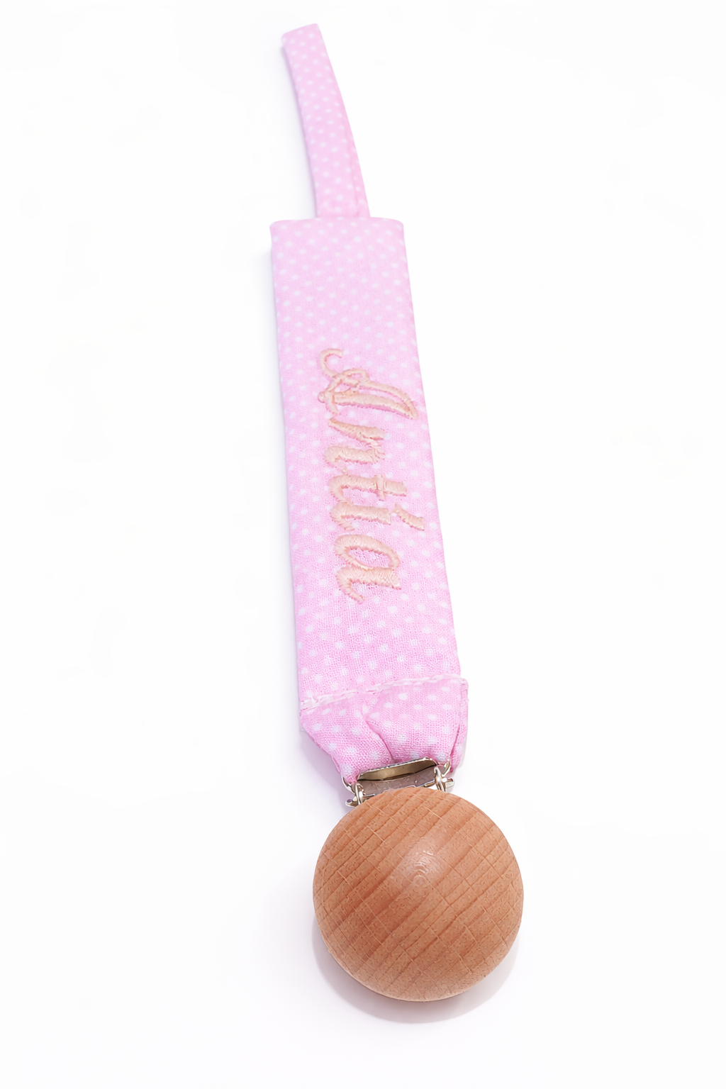 Chupetero de tela rosa con topitos blancos personalizado con nombre bordado a máquina y broche de madera natural.