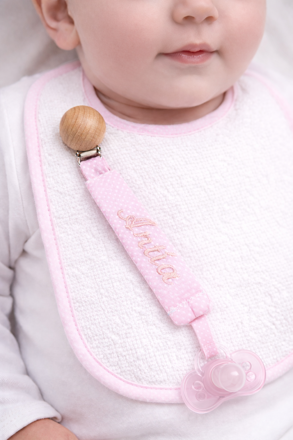 Chupetero personalizado con nombre bordado a máquina.
