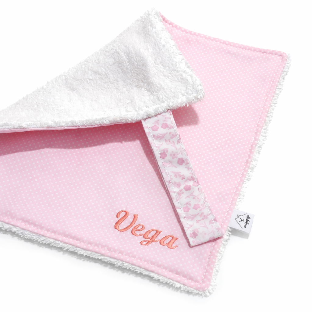 La toallita multiusos es de la colección Flores rosas y rizo 100% algodón. Las medidas son 25cm x 25cm. Se puede personalizar con una inicial bordada.