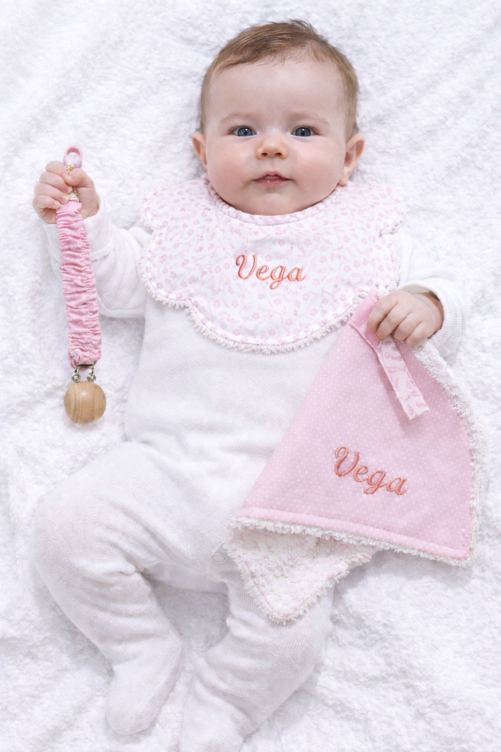 Conjunto formado por babero con opción de bordar el nombre, una toallita multiusos con la opción de bordar el nombre o una inicial y un chupetero elástico con broche de madera, todo ello con el estampado Flores rosas..