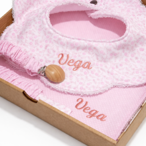 Conjunto bebé colección Flores rosas de babero, toallita multiusos y chupetero. Disponible también en azul.